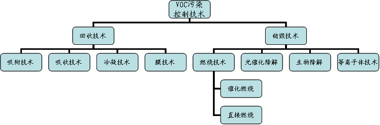 VOC的控制技术基本分为两大类。类是预防性措施,以更换设备、改进工艺技术、防止泄漏乃至消除VOC处理排放为主,这是人们所期望的,但是以目前的技术水平,向环境中排放和泄露不同浓度的有机废气是不可避免的,这时就必须采用第二类技术。第二类技术为控制性措施,以末端治理为主。末端控制技术包含两类,类是非破坏性方法,即采用物理方法将VOC回收;第二类是通过生化反应将VOC氧化分解为无毒或低毒物质的破坏性方法。常用的控制技术如图所示。